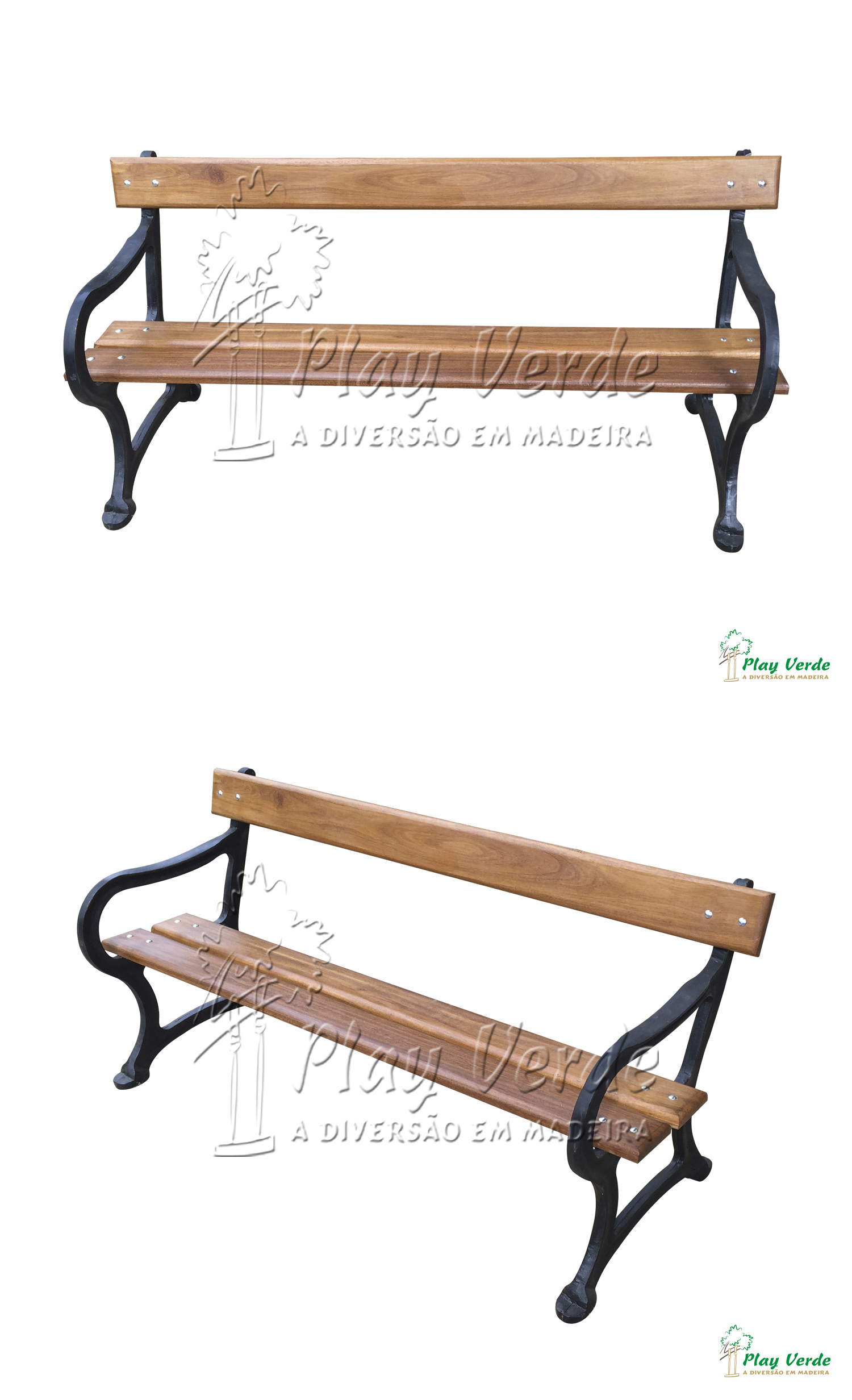 Banco com pés de ferro fundido, assento e encosto compostos por 3 réguas em Cumaru com 3 cm de espessura. Esse banco é ideal para jardins, praças, shopping centers, dentre outros.