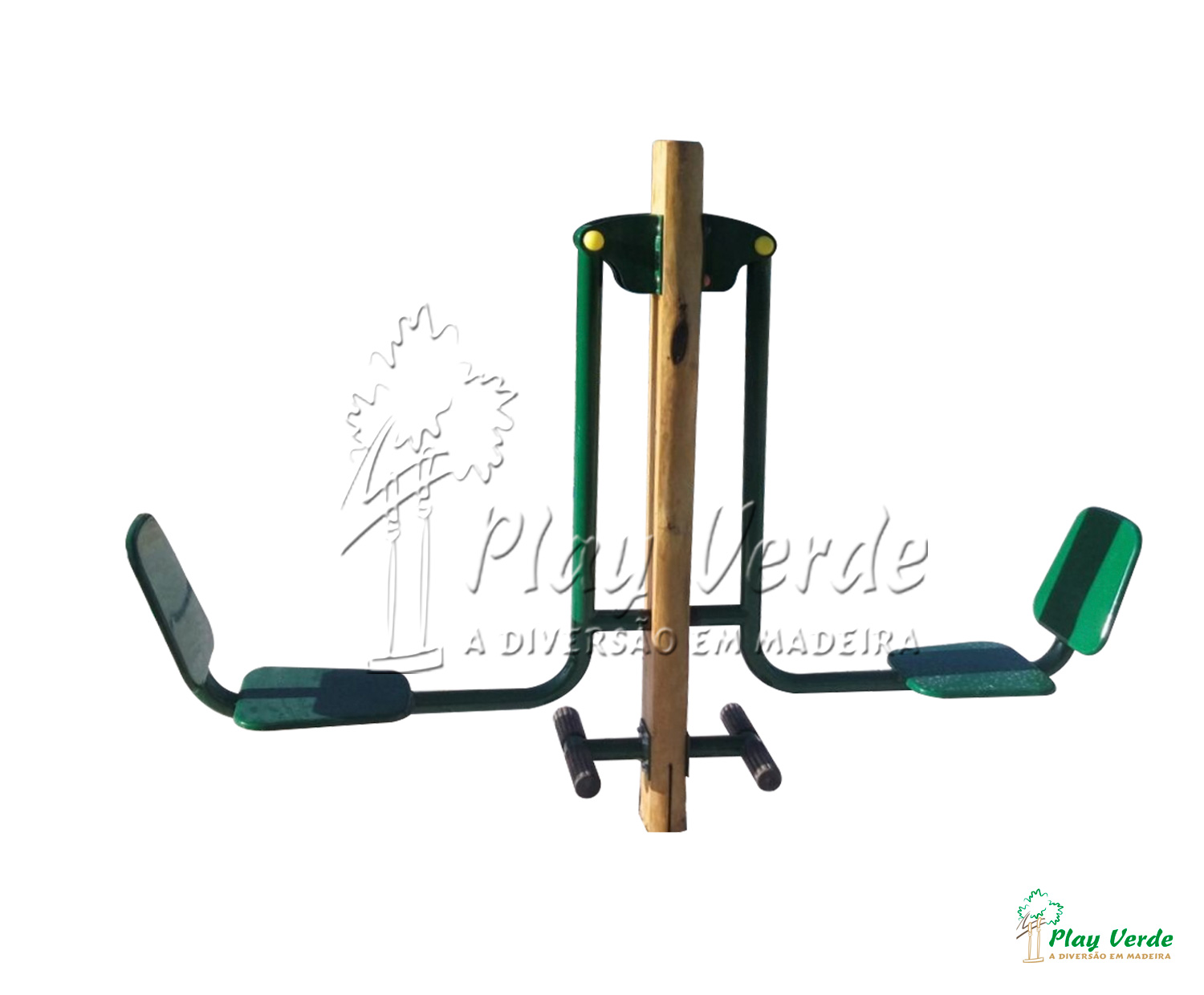 Equipamento de ginástica contendo dois assentos confeccionados com material galvanizado e pintura eletrostática, fixados em uma base de eucalipto autoclavado.