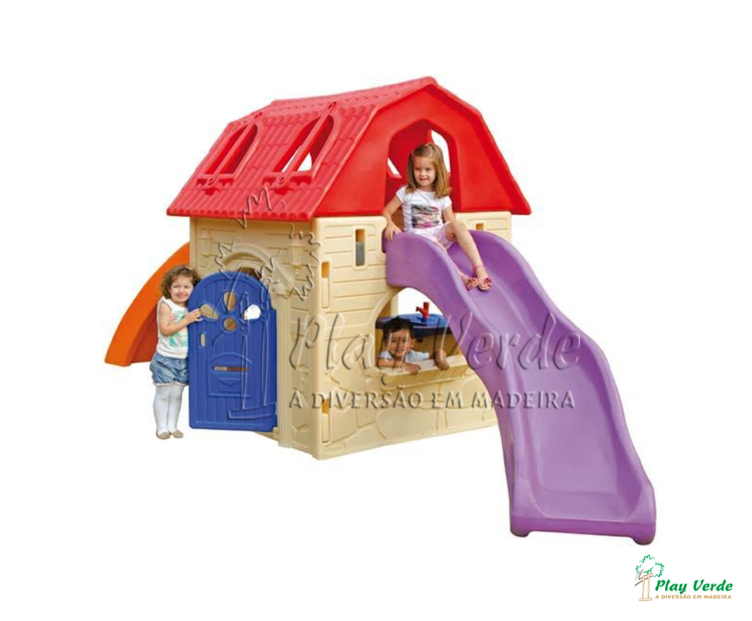 Uma casinha com texturas de madeira e rocha que conquista toda a criançada. Com escadas e escorregador em ondas a brincadeira fica mais divertida. O seu interior é composto de relevos decorativos e de uma pia para lavar pratos, simulando uma cozinha de verdade. De fácil montagem e desmontagem, dispensa o uso de ferramentas.
