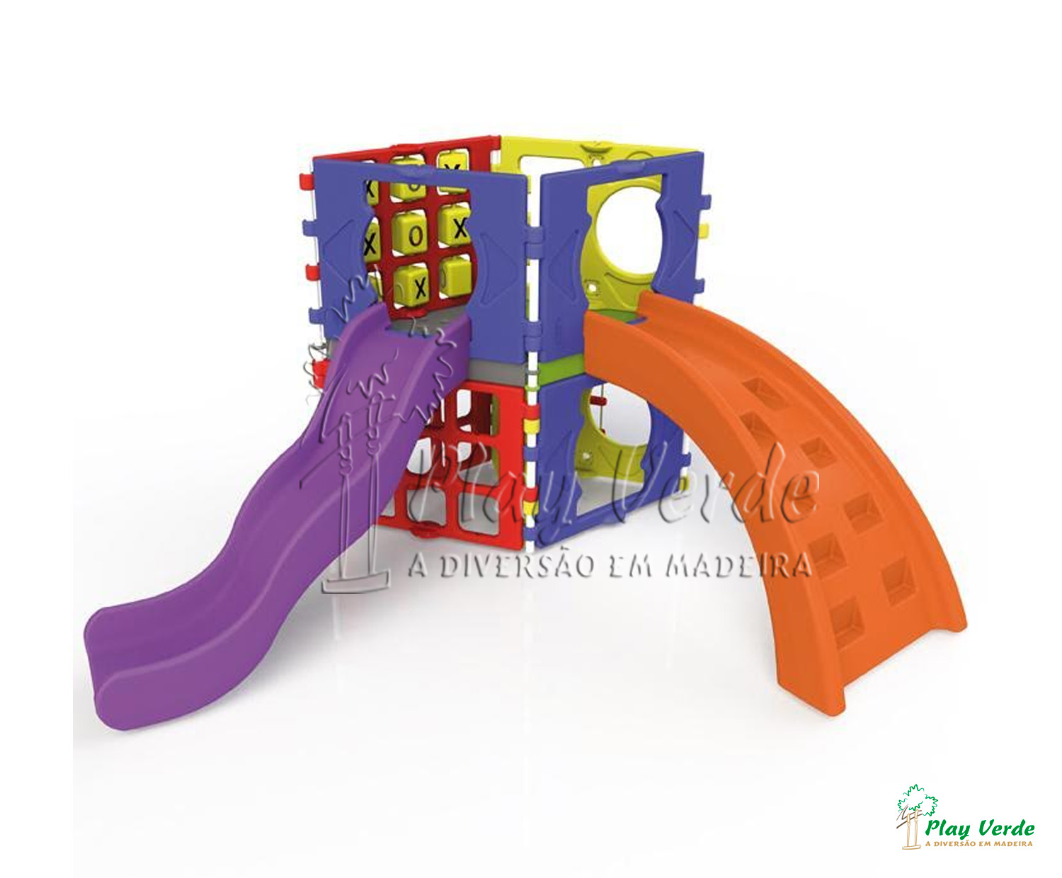 Neste modelo acompanha parede de escalada, escorregador em curva e jogo da velha gigante. Pode ser usado por crianças a partir dos 3 anos de idade e é formado por um módulo. Comprimento: 3,08 m Largura: 2,92 m Altura: 1,80 m